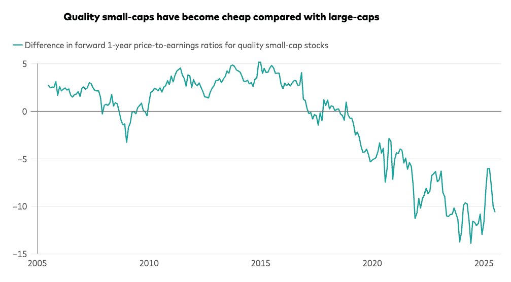 The silver lining is that small-cap valuations have fallen to very attractive levels. By mid-2025, quality small-cap stocks (profitable ones) were trading at a significant discount to comparable large-caps.
